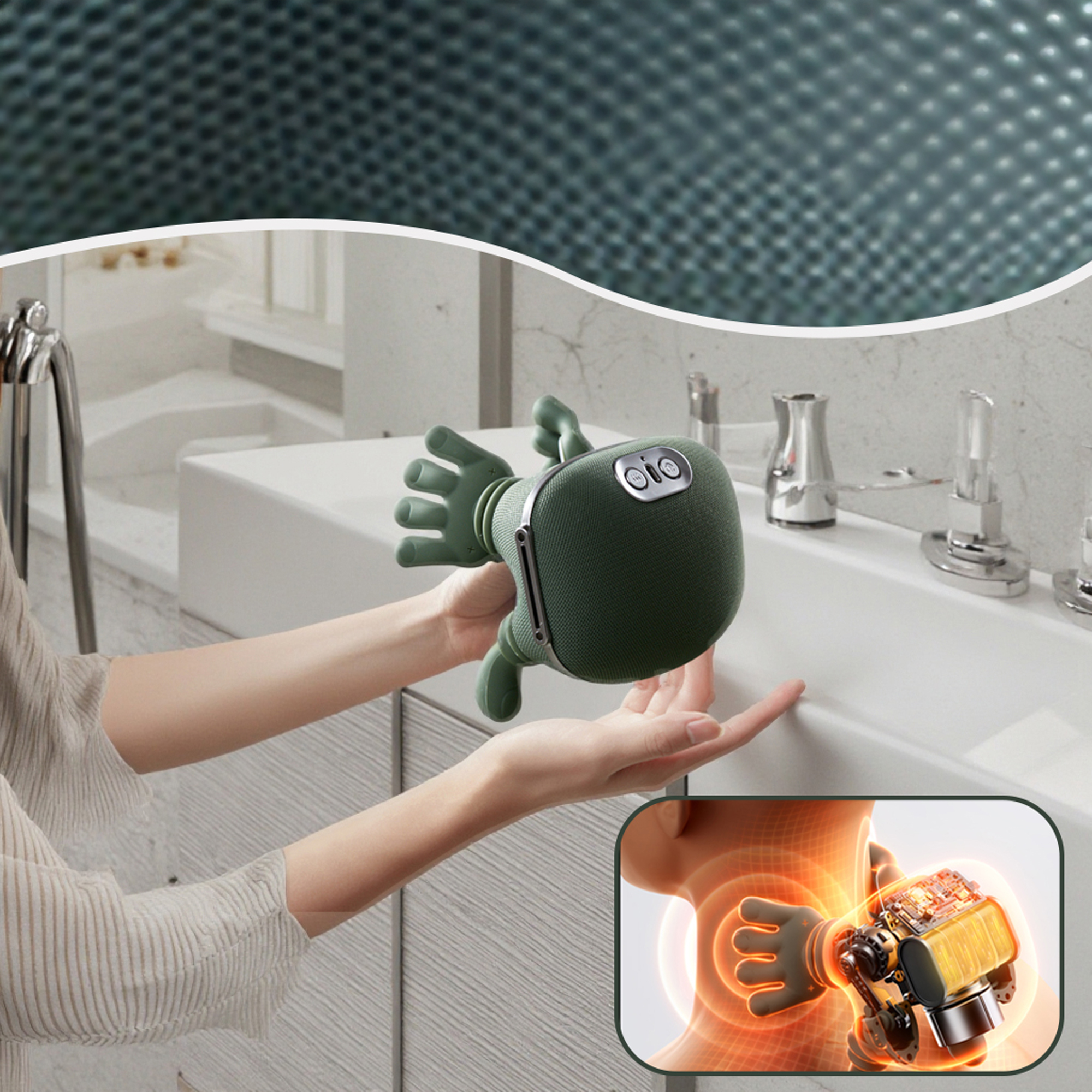 مدلك خفيف الوزن مصمم بتقنية عجن تحاكي ضغط راحة اليدين، يساعد على استرخاء العضلات وتخفيف التيبس بعد يوم عمل طويل أو إجهاد مستمر.